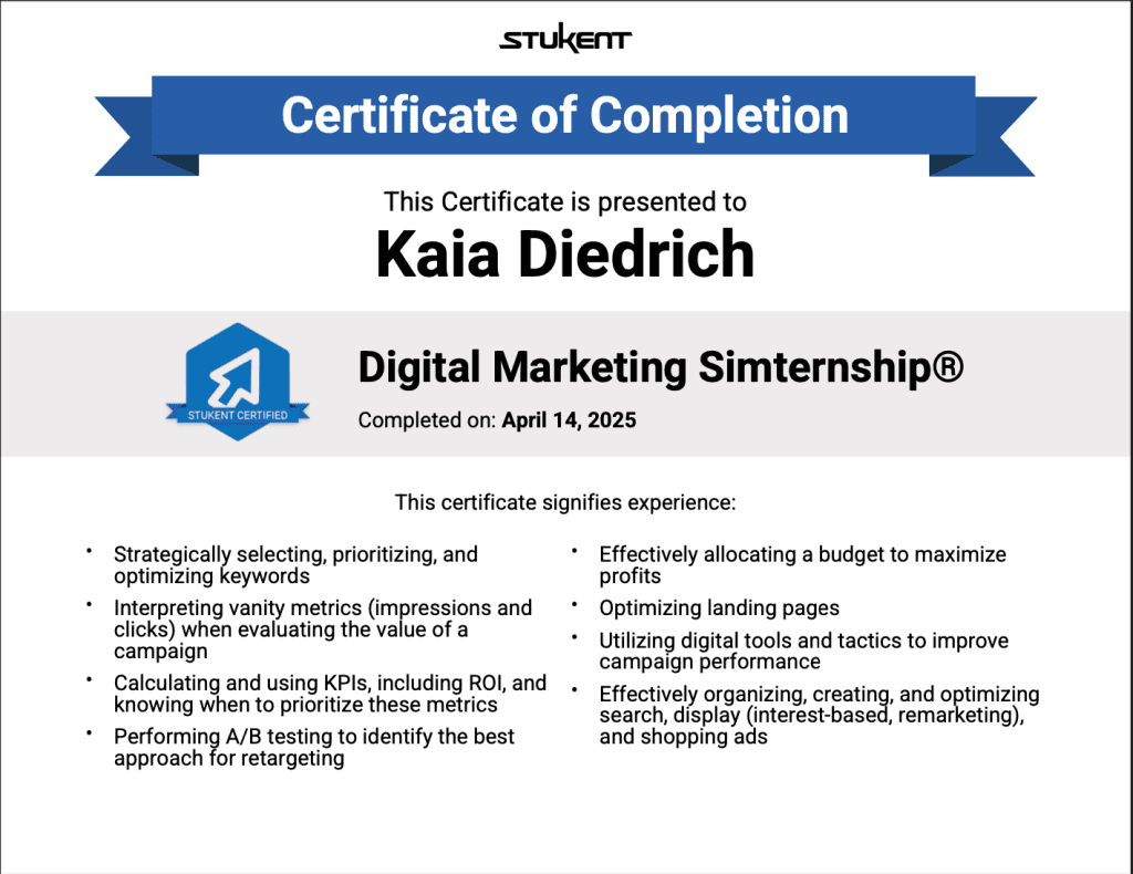 I completed HubSpot Academy’s Content Marketing Certification, gaining practical skills in content strategy, storytelling, SEO, and performance analysis. This training strengthened my ability to create purposeful, audience-focused content and develop campaigns that support broader marketing goals.