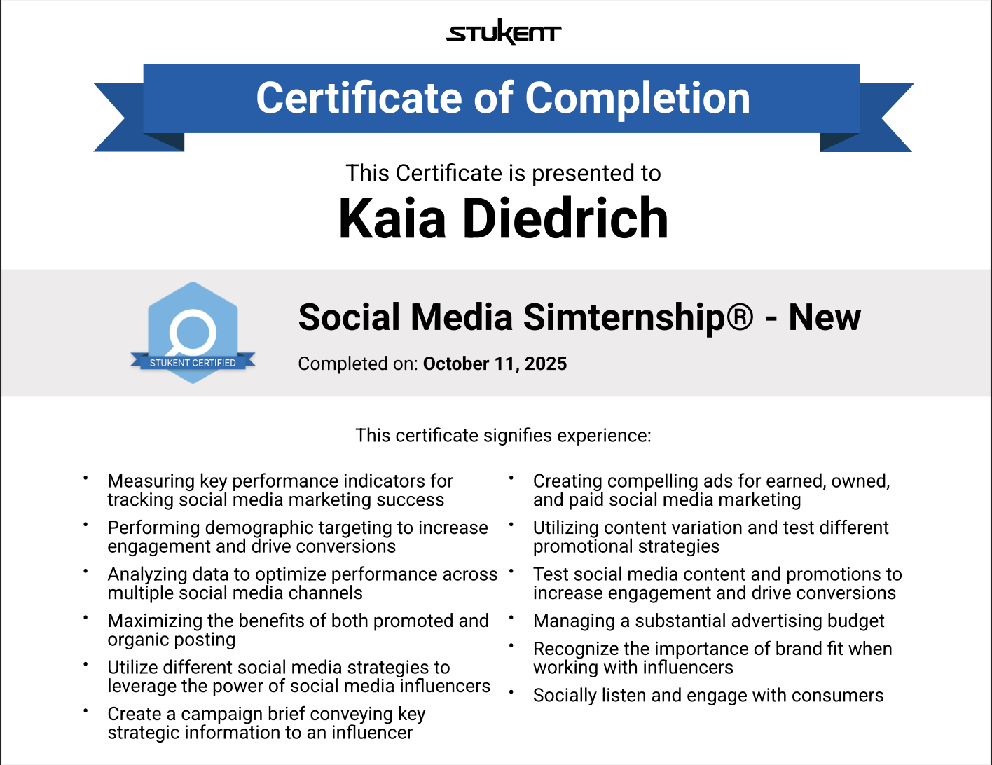 I completed HubSpot Academy’s Social Media Certification, where I deepened my understanding of how to build and execute effective social media strategies. I learned to identify audience segments, develop a content calendar, create engaging social content, and measure performance using social analytics. This training helped me sharpen my ability to craft social campaigns that align with business goals and drive meaningful engagement.